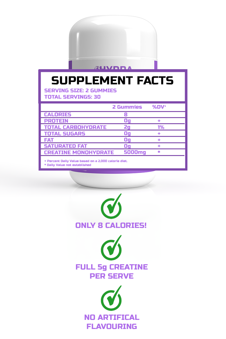 Pump up your routine with 2 delicious gummies packed with 5g of pure Creatine Monohydrate. At only 8 calories per serve, these tasty gummies are the perfect treat for even the most stringent of diet regiments.